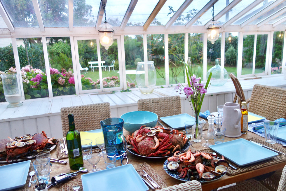 Climb the few steps that lead to the first small glass walled entrance, let yourself be enchanted ((carried away)) by this atmosphere of a seaside family home which, immediately, will be yours.